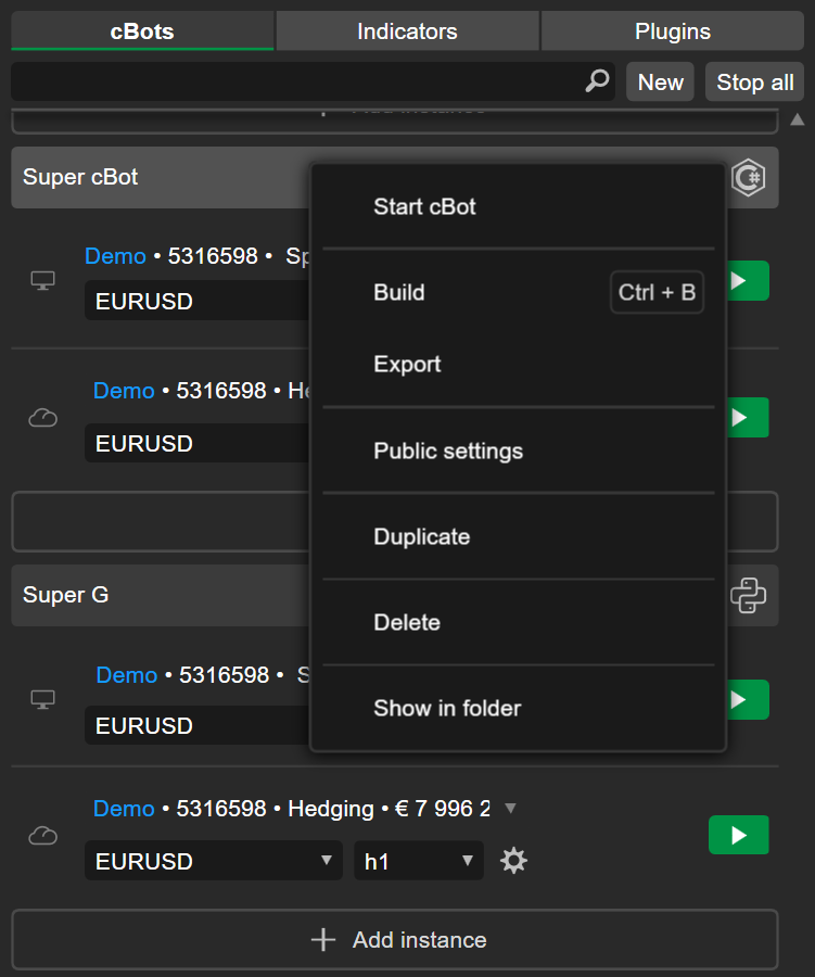 In cTrader Algo, click the Export button on the algorithm you want to export, or you can right-click the algo and click Export.