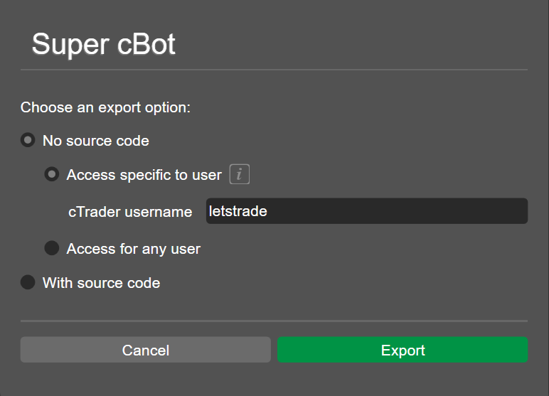 | With source code | Generate the .algo file with source code, granting access to all cTrader users. | Store the .algo file in a safe, personal folder to serve as a backup of your source code. |