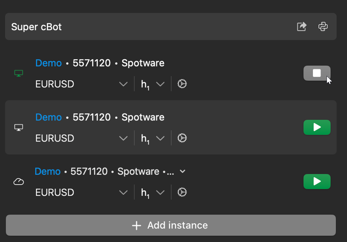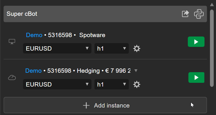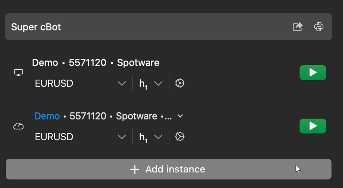 Both local and cloud instances can be added in cTrader Windows and Mac, whereas only cloud instances can be added in cTrader Mobile and Web.
