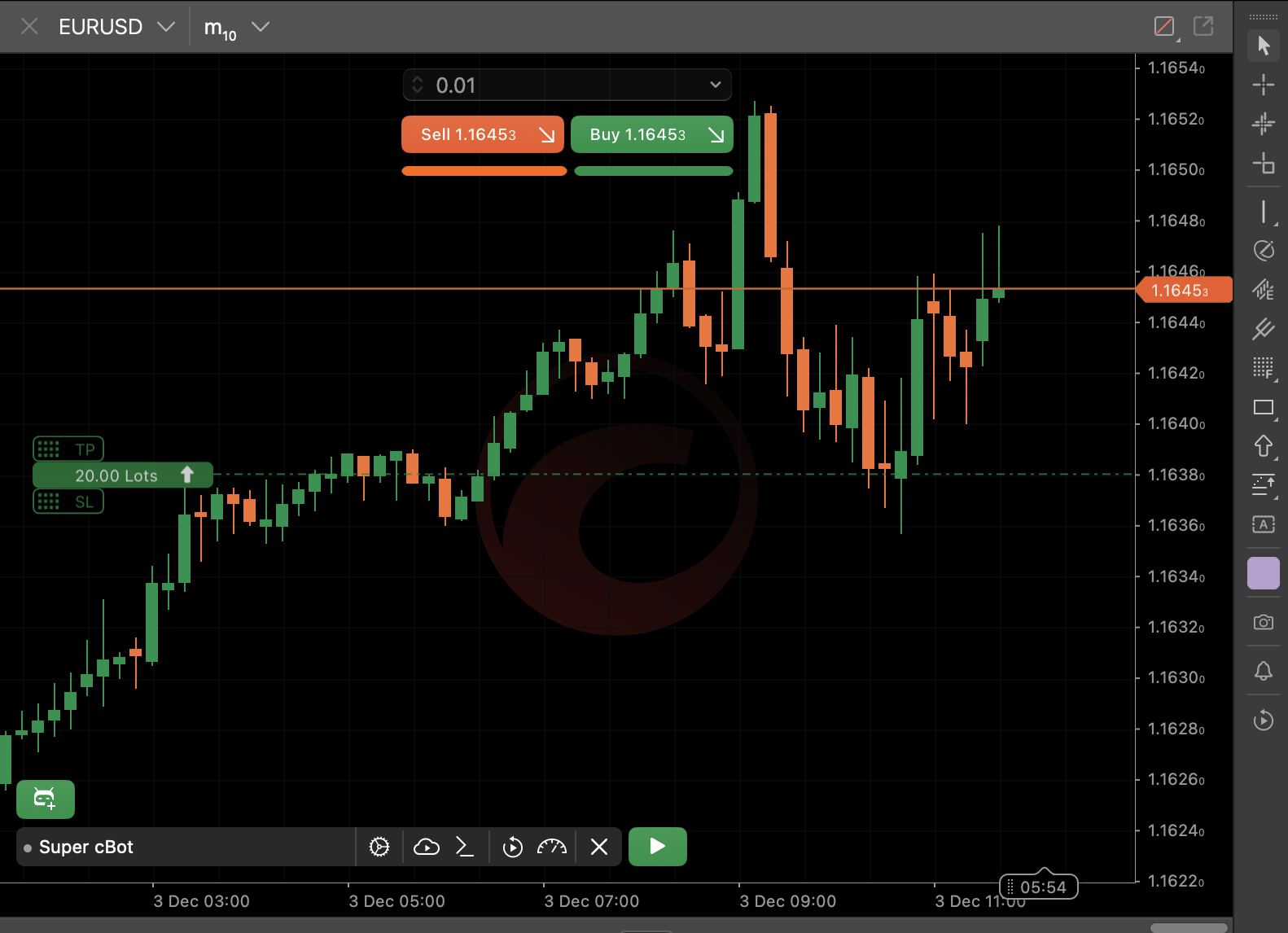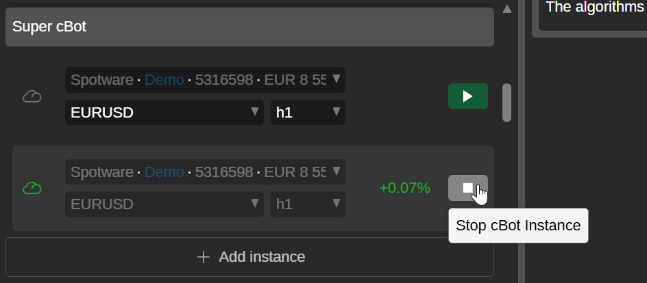 Click the Start cBot button and the new instance begins running automatically, but you can stop it if needed.