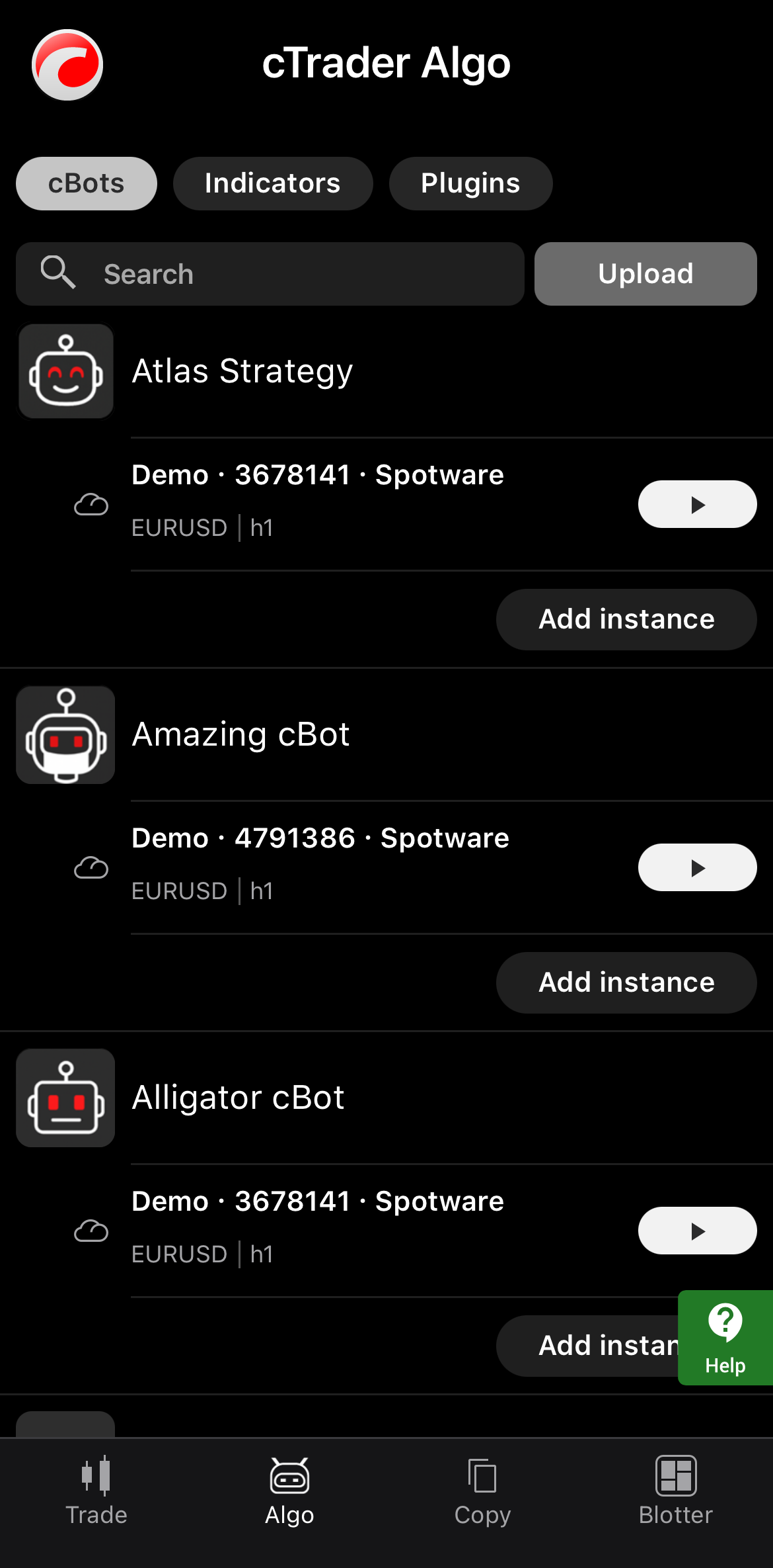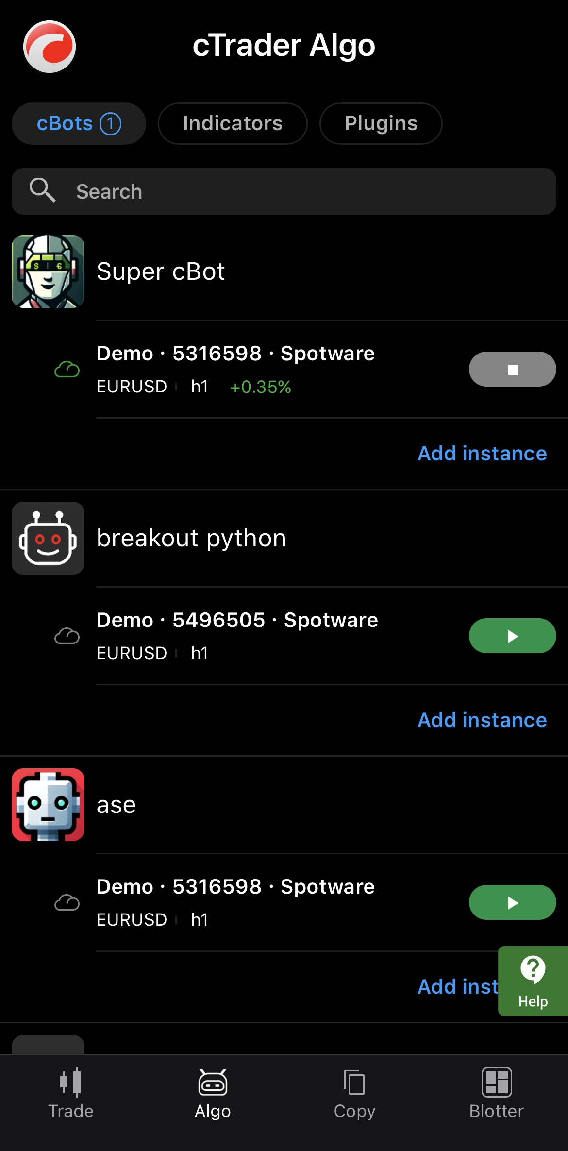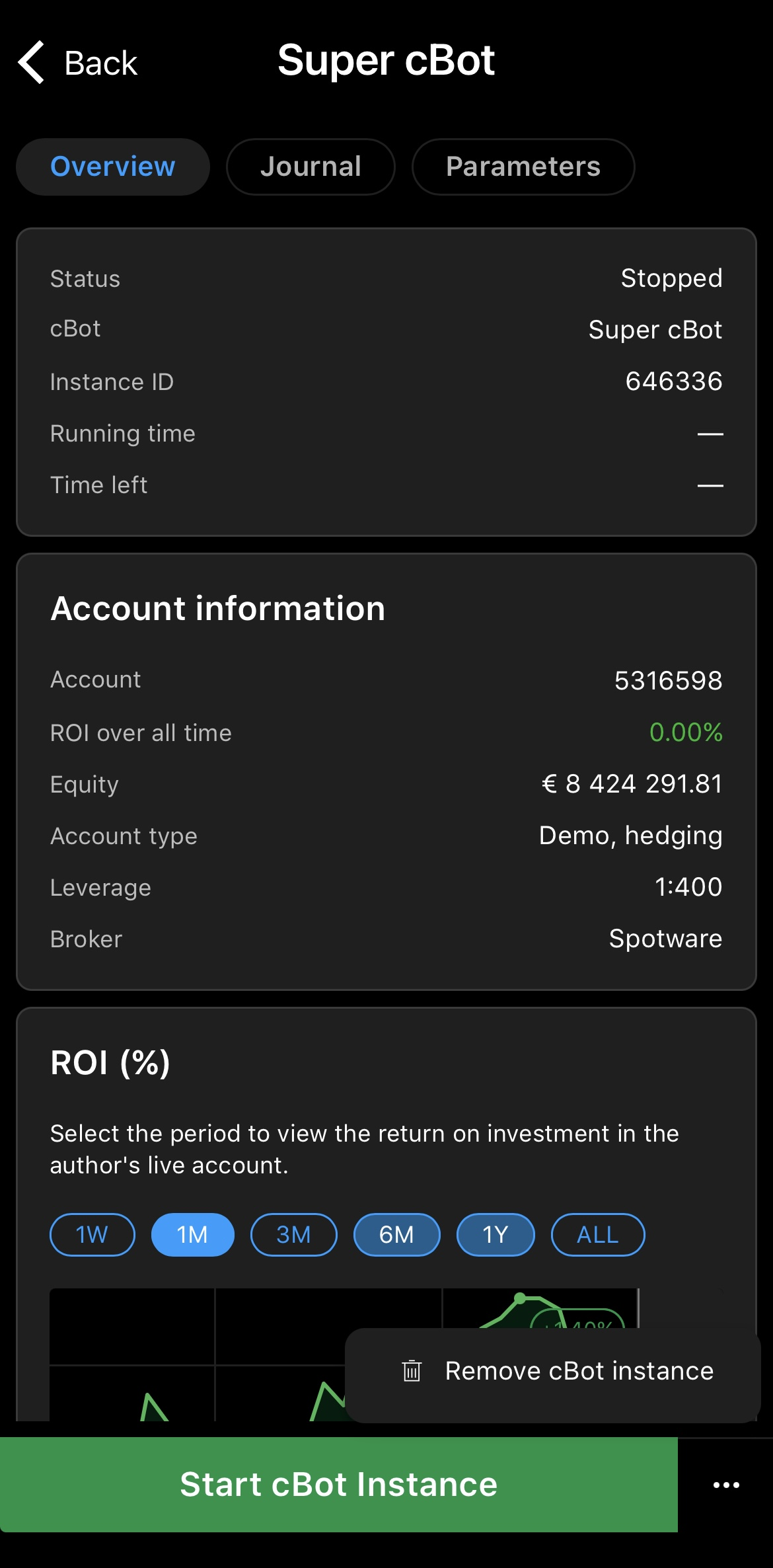 Tap the instance you want to delete, press the More icon in the bottom-right corner and select Remove cBot instance.