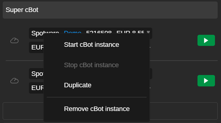 To start a cBot, tap the Start icon on any available instance in cTrader Algo.