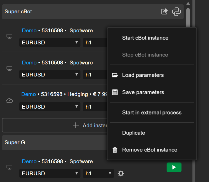Right-click the instance you want to delete, then select Remove cBot instance.
