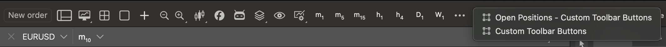 In addition to ASP and the chart toolbar shown here, plugin placements and commands showcase plugins appearing in Trade Watch, custom windows and custom frames. Videos and step-by-step instructions on creating plugins for all possible UI areas are available in plugin how-tos.