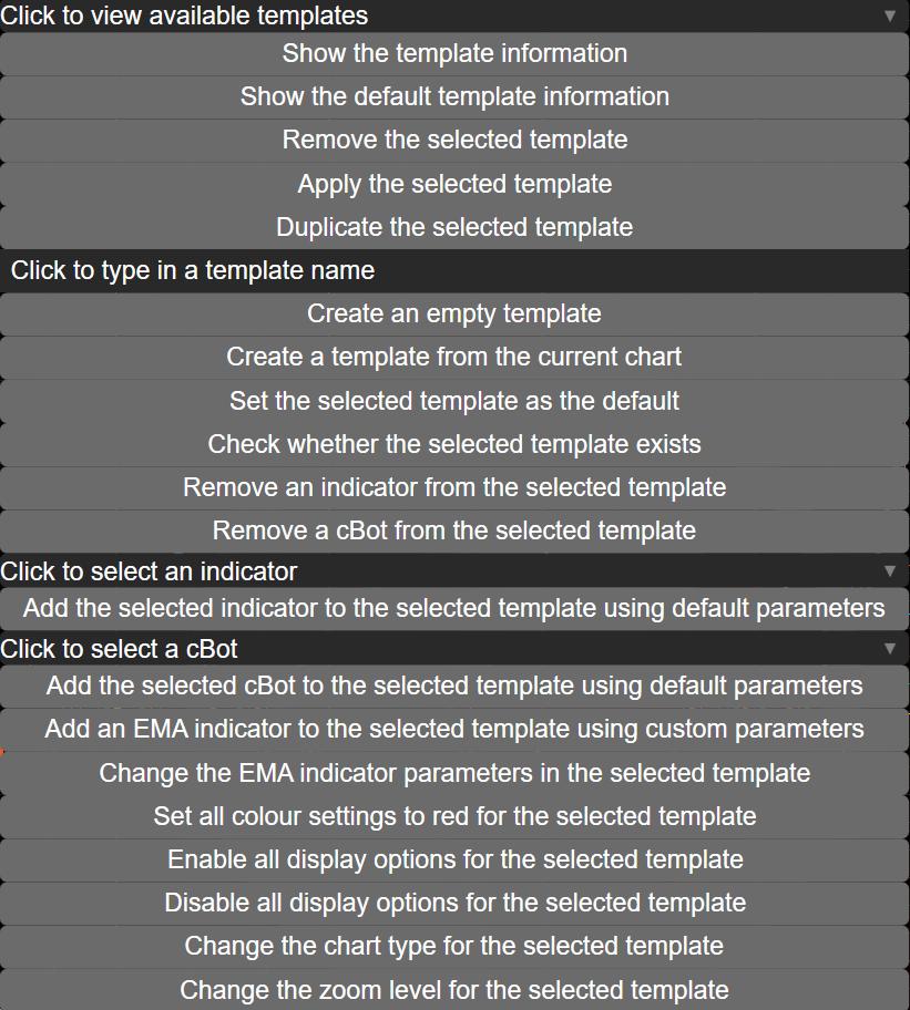 Consider a Chart Templates Manager cBot, which when added and started on a chart, displays a menu for performing various tasks with chart templates.
