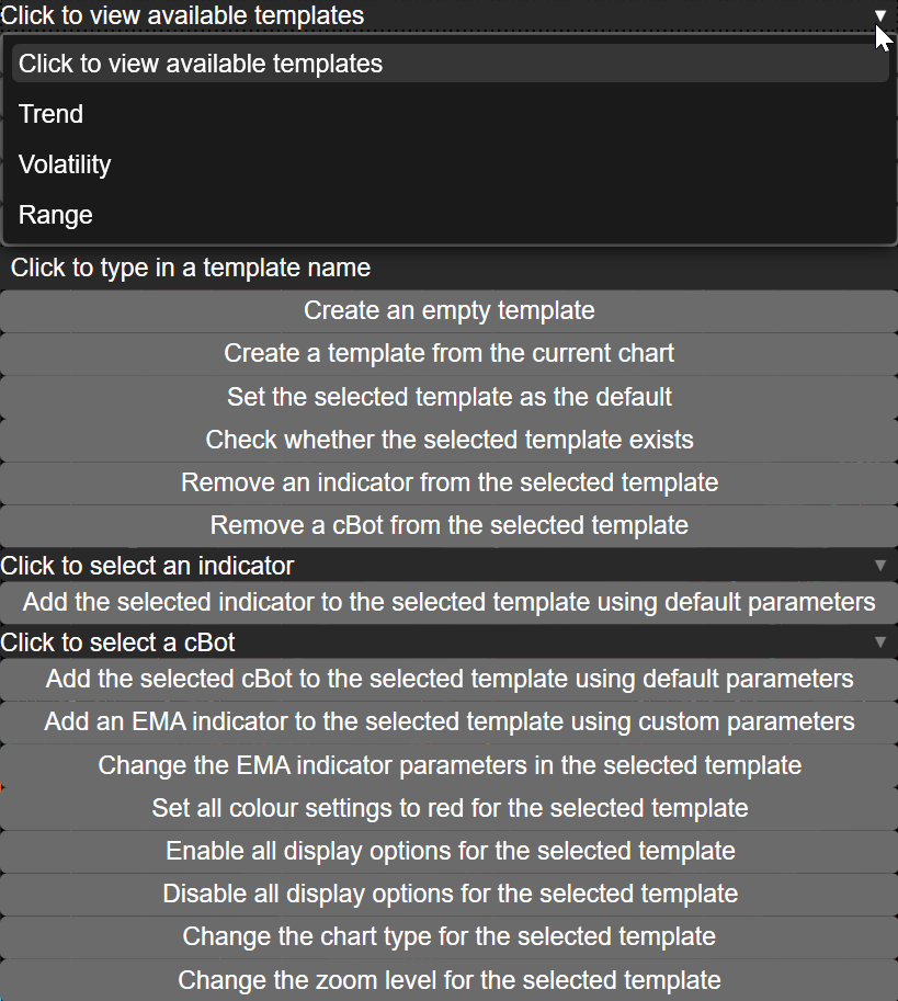 template.Apply(Chart) to apply a template to a target chart. template.Indicators to add or remove indicators, access their parameters. template.Robots to add or remove cBots. template.ColorSettings to work with chart or theme colours template.DisplaySettings to work with chart type, zoom and various toggles, including positions, orders, grid, sentiment and more.