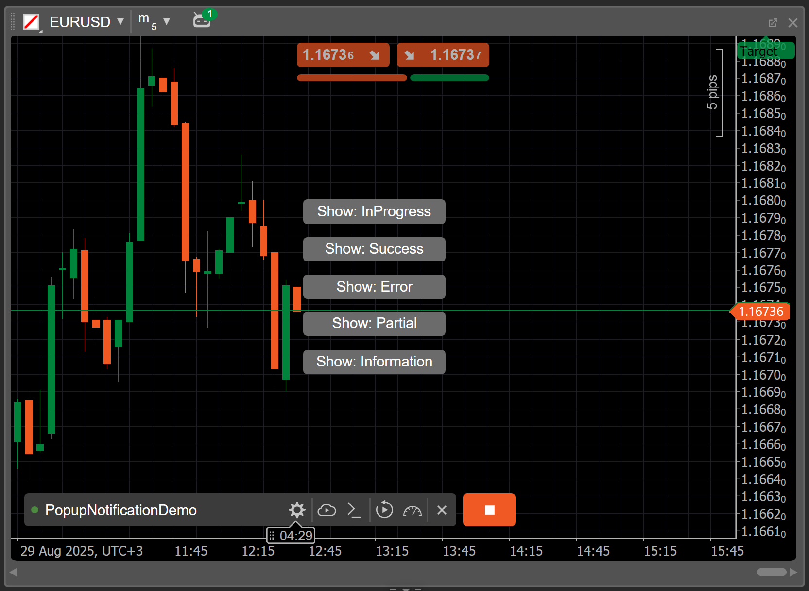 The custom notification API includes types that enable trading algorithms to deliver real-time popup alerts directly in cTrader. These popups allow cBots, indicators and plugins to communicate progress, success, errors or general information to users visually and contextually.