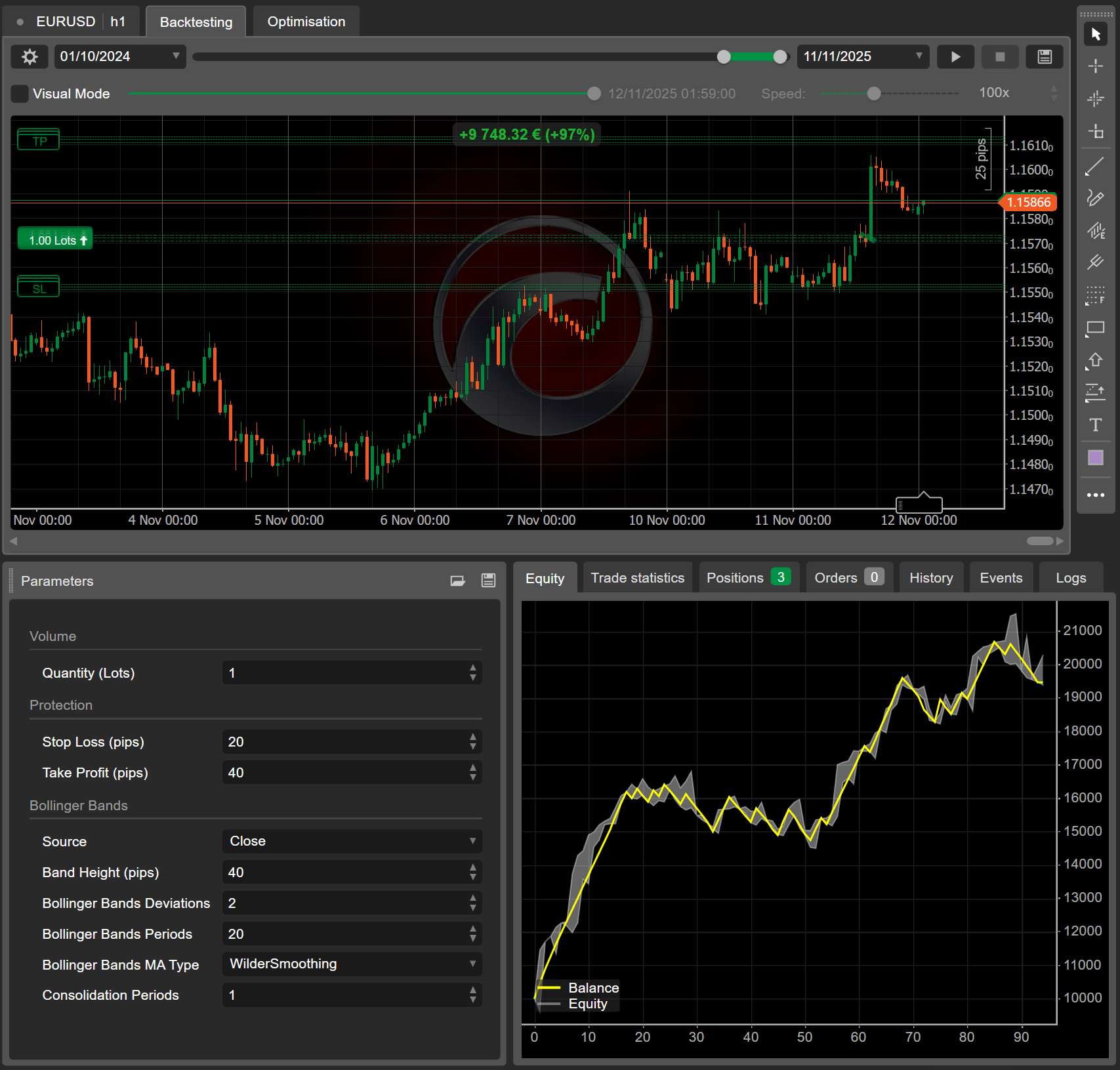 This time, the backtesting report over the same period shows a 97% gain, a massive improvement when compared to the 22% delivered by the original cBot logic.