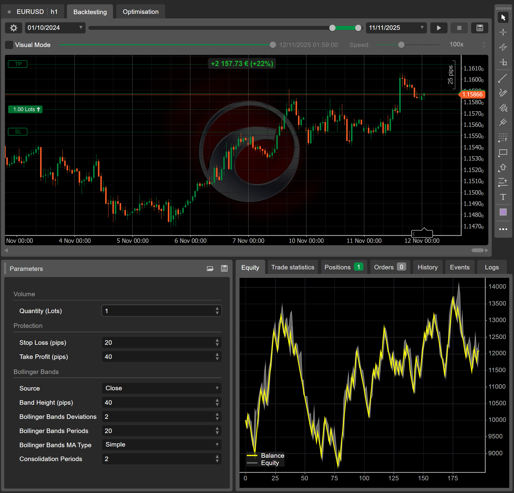 In the main grid, navigate to the Backtesting tab. Perform a one-year backtest using the default parameters to evaluate the robot results. The cBot produces a 22% gain for this period, delivering 74 winning trades from 194 as recorded in the Trade statistics tab.