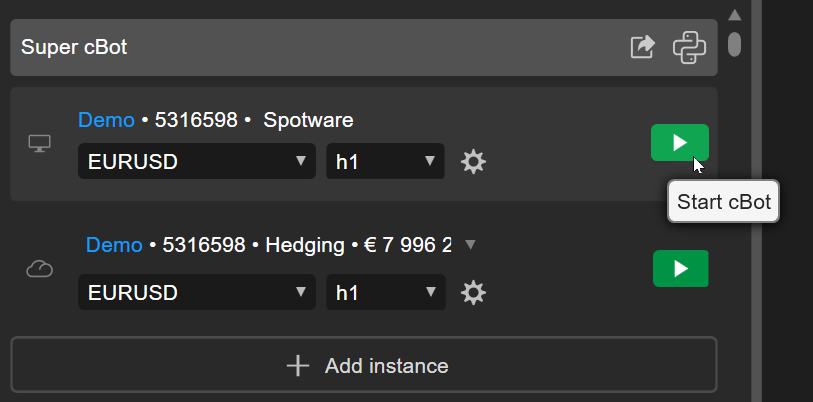 Let's return to our cBot and build it. Now, click the Start cBot icon for any instance, and the trading bot will begin running.