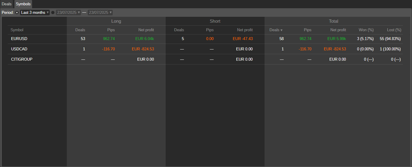 交易品种标签页列出了当前账户交易的所有交易品种,基于已平仓头寸,并在相应列中显示交易、点数、净利润、盈利和亏损百分比的统计数据。