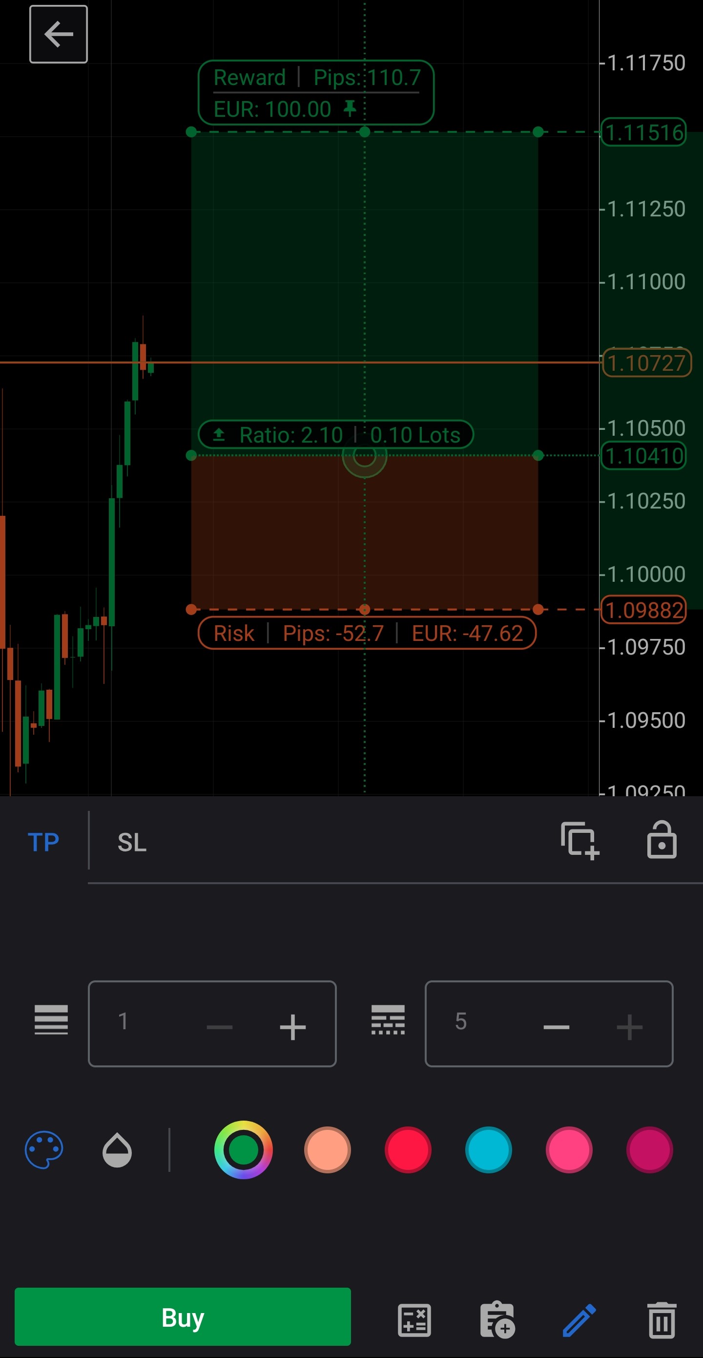 Dengan objek risiko-imbalan sudah ada di grafik, ketukan tunggal pada tombol Beli atau Jual akan menempatkan order.