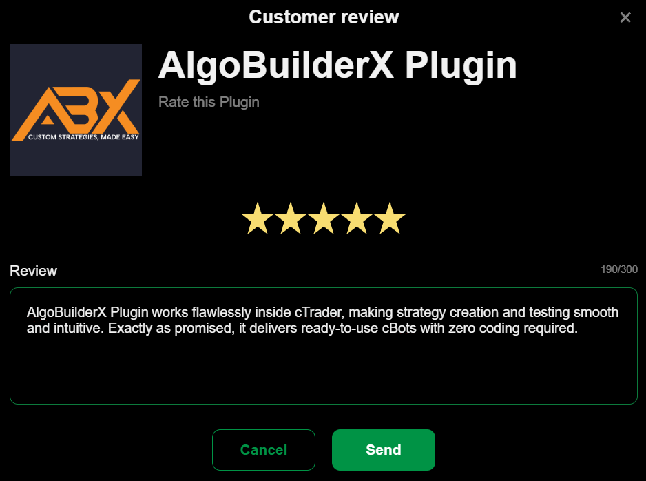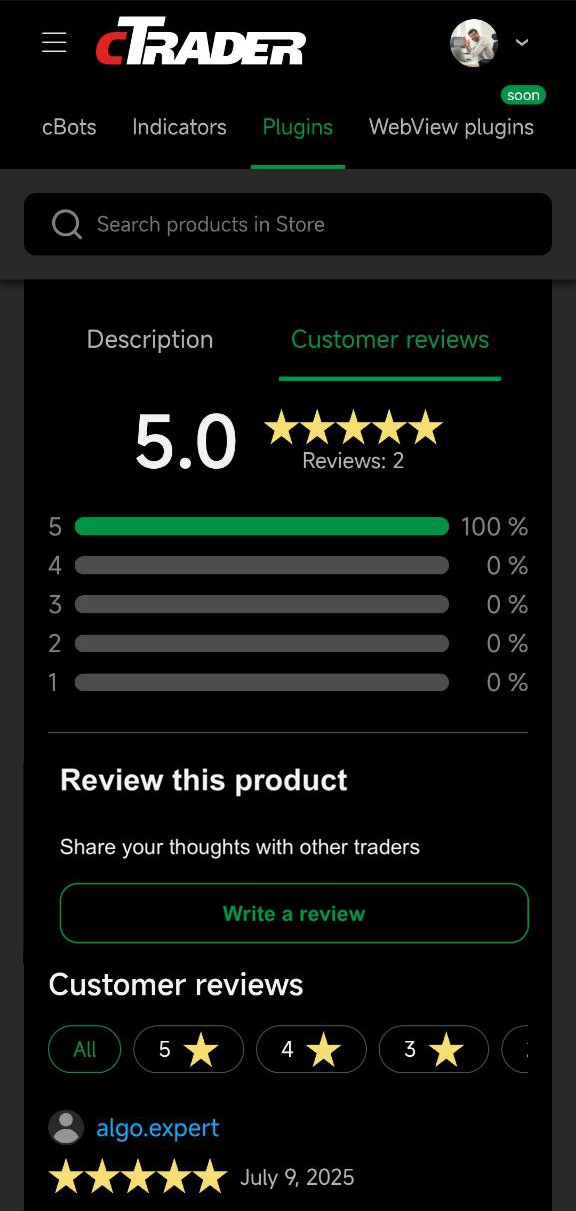 En cTrader Store, puede dejar reseñas para ayudar a los vendedores a mejorar sus productos y ayudar a otros compradores a tomar decisiones informadas.