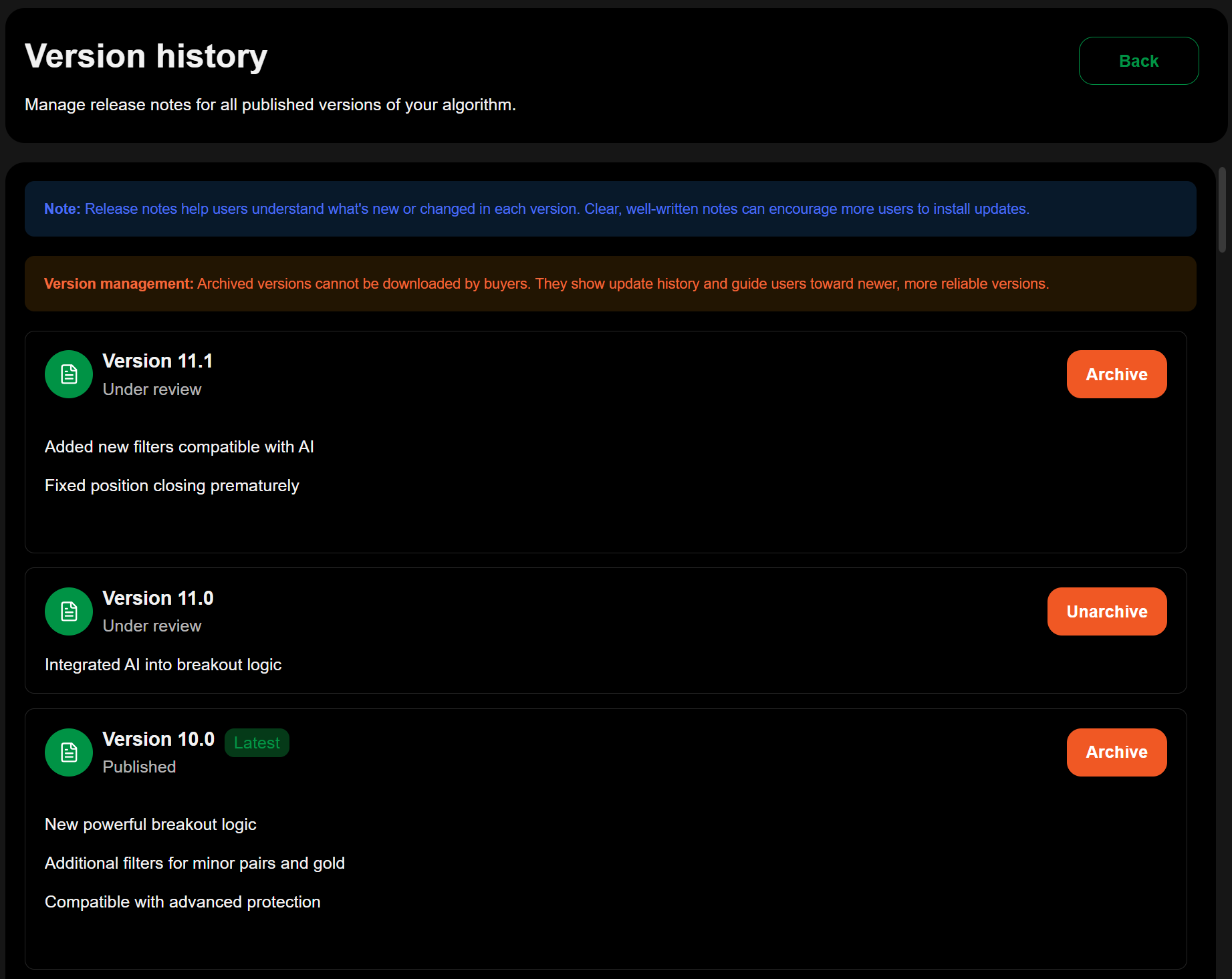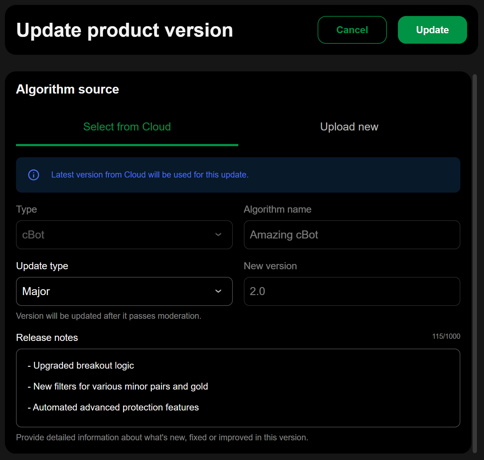 cTrader 商店中的版本控制允许卖家在保持产品变更的结构化记录的同时,提供更新、增强和新功能。