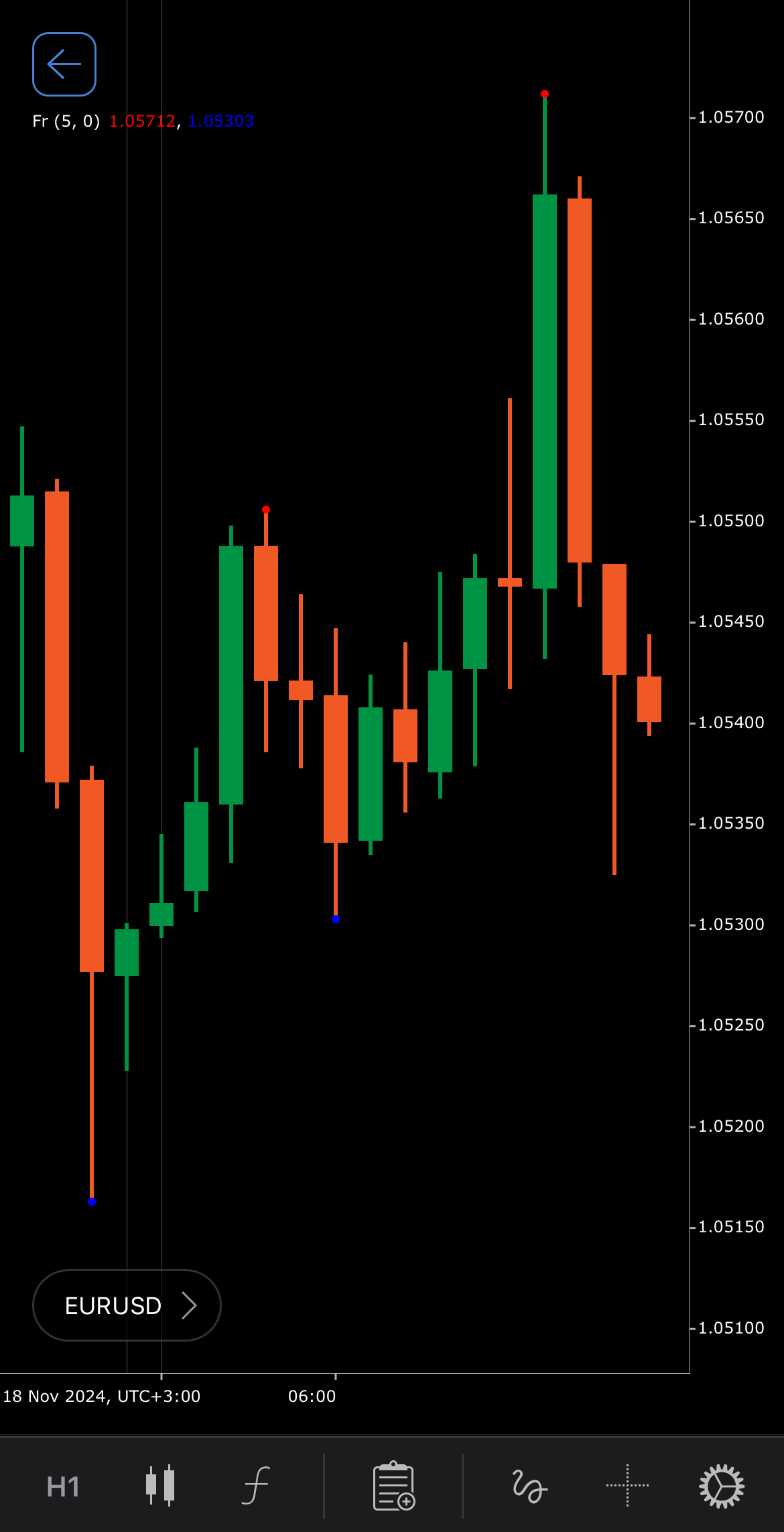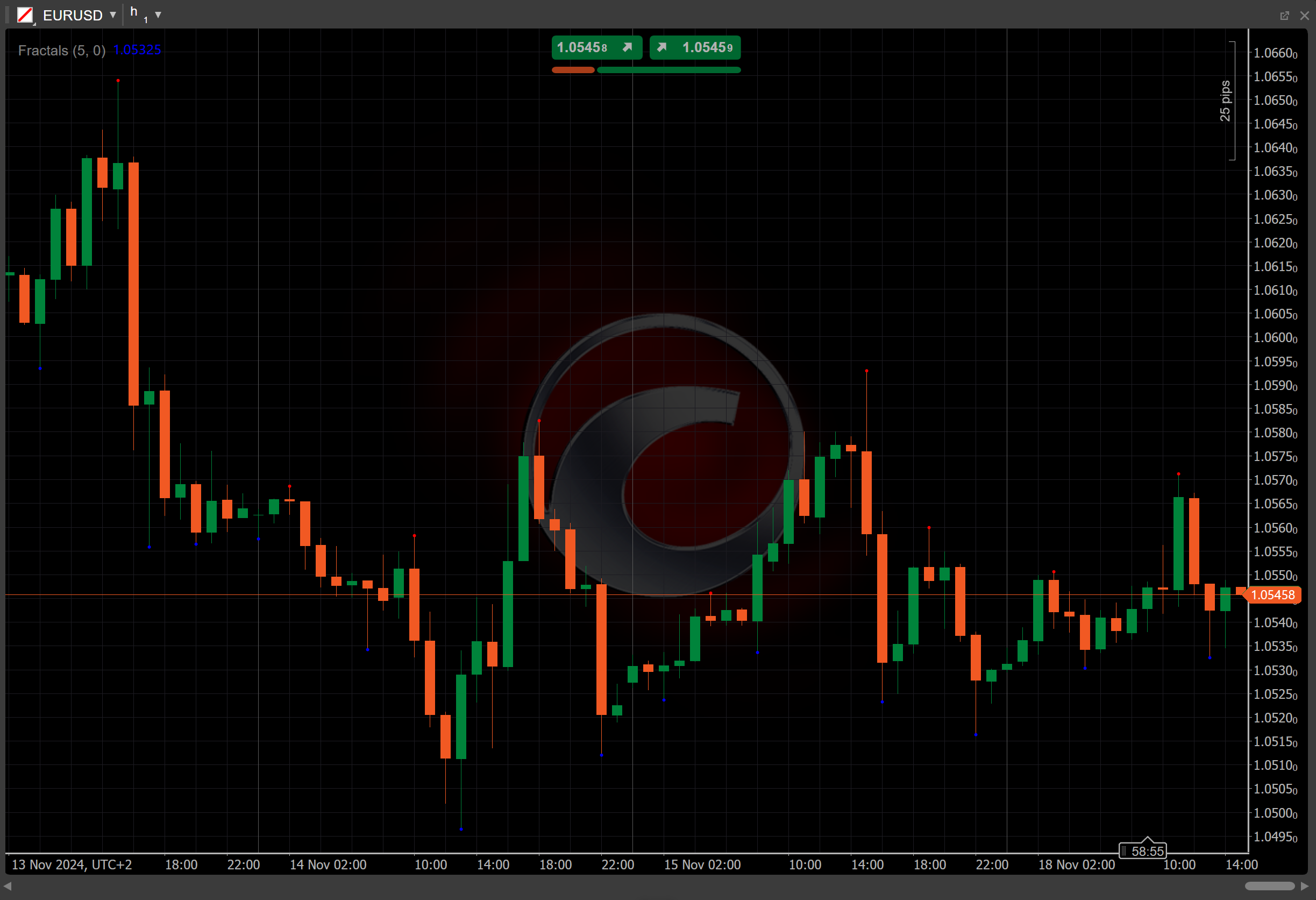 The Fractals indicator helps traders identify potential market reversals by marking local highs and lows. Developed by Bill Williams, it is widely used to spot key turning points and confirm trends. Williams derived the concept of fractals from fractal geometry, which is used to analyse repeating patterns in nature. The Fractals indicator identifies up fractals and down fractals by comparing the current bar's high or low to the highs or lows of surrounding bars within a specified period.