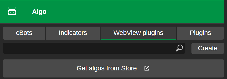 In the WebView plugins tab of cTrader Algo, click Get algos from Store, and multi-platform plugins in cTrader Store will open.