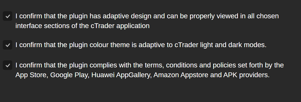Select the options to confirm that your WebView plugin complies with the rules and policies of cTrader, App Store, Google Play, Huawei AppGallery, Amazon Appstore and others.