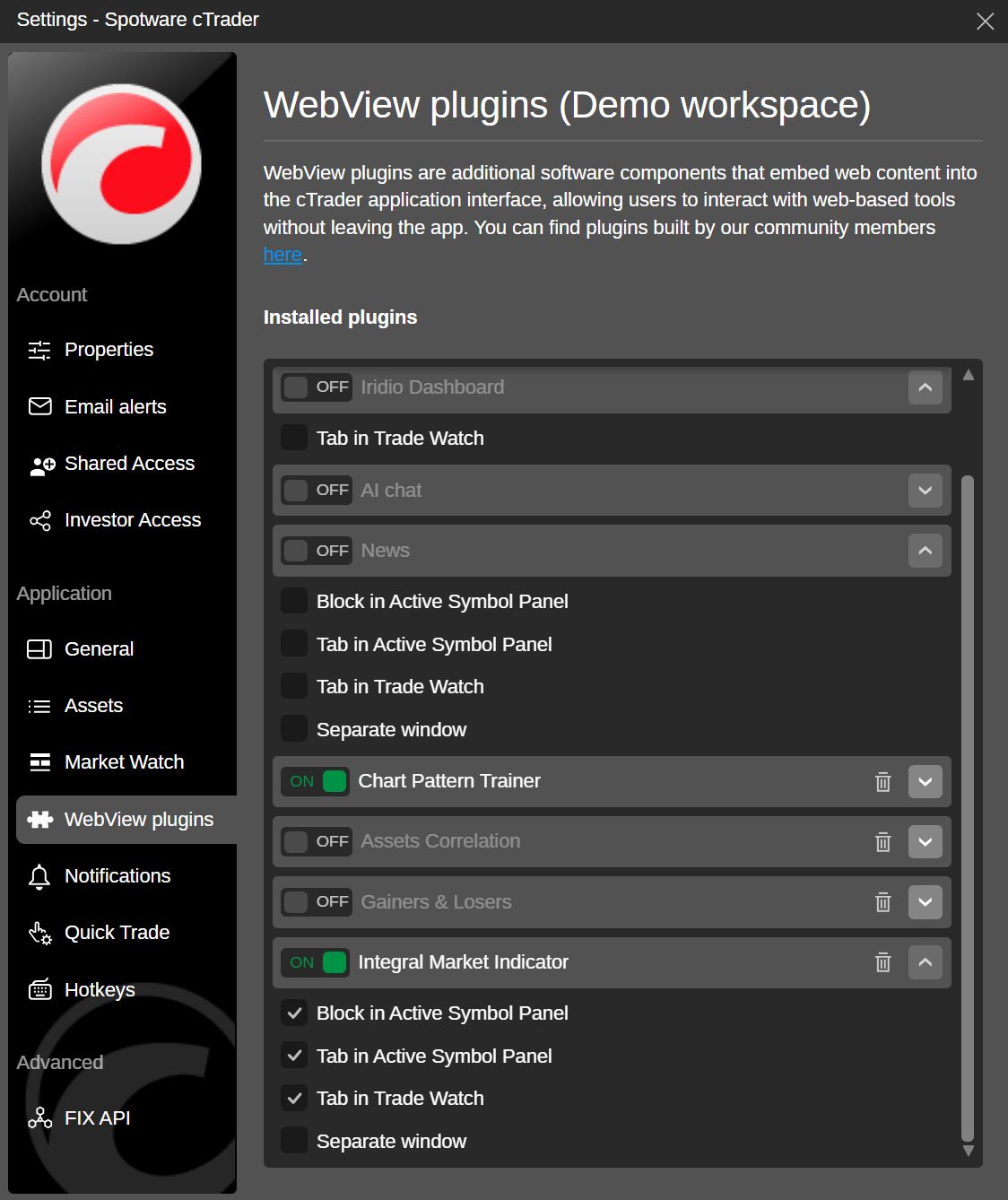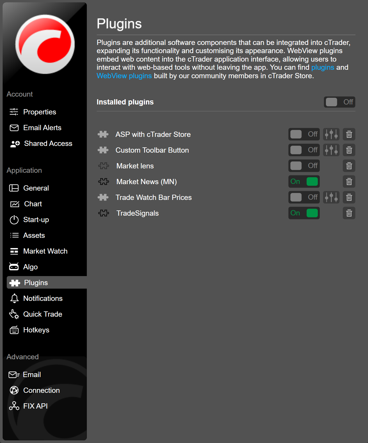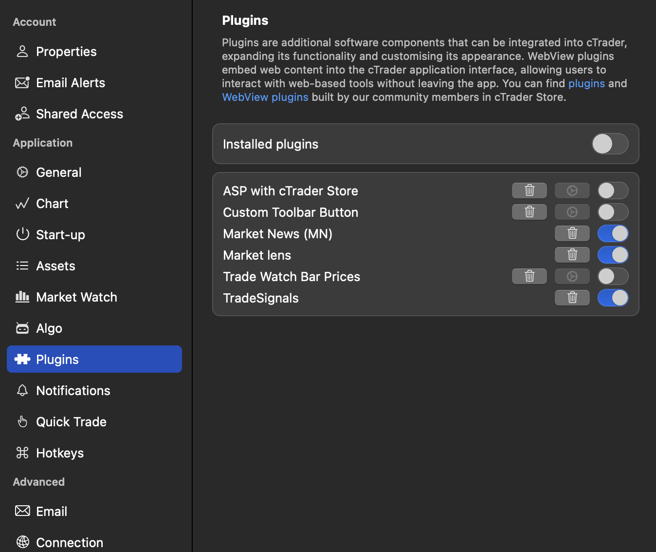 In the WebView plugins section of the cTrader settings, use the toggle to enable or disable a WV plugin. To delete a plugin, click the Delete icon and confirm the action.