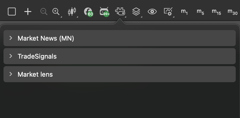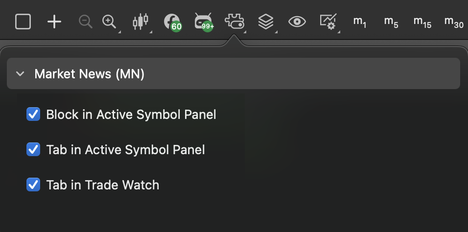The visibility of WV plugins can be controlled in the settings window, or you can click the WebView plugins icon in the chart toolbar to open a dedicated dialog.