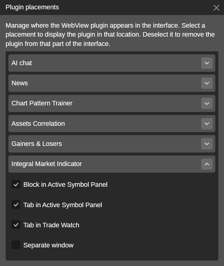 Click the WebView plugins icon in the chart toolbar to open a new dialog for controlling plugin placements.